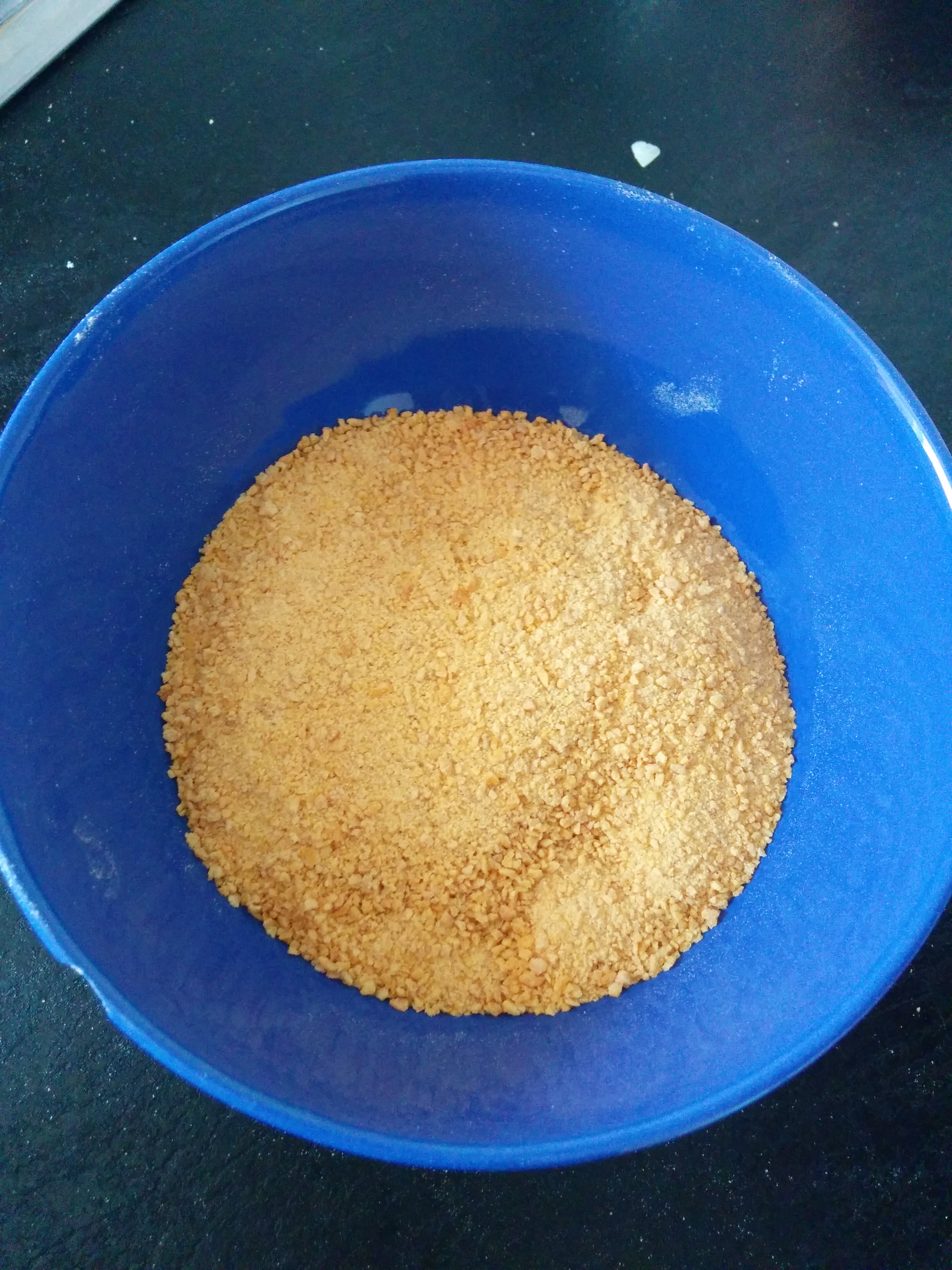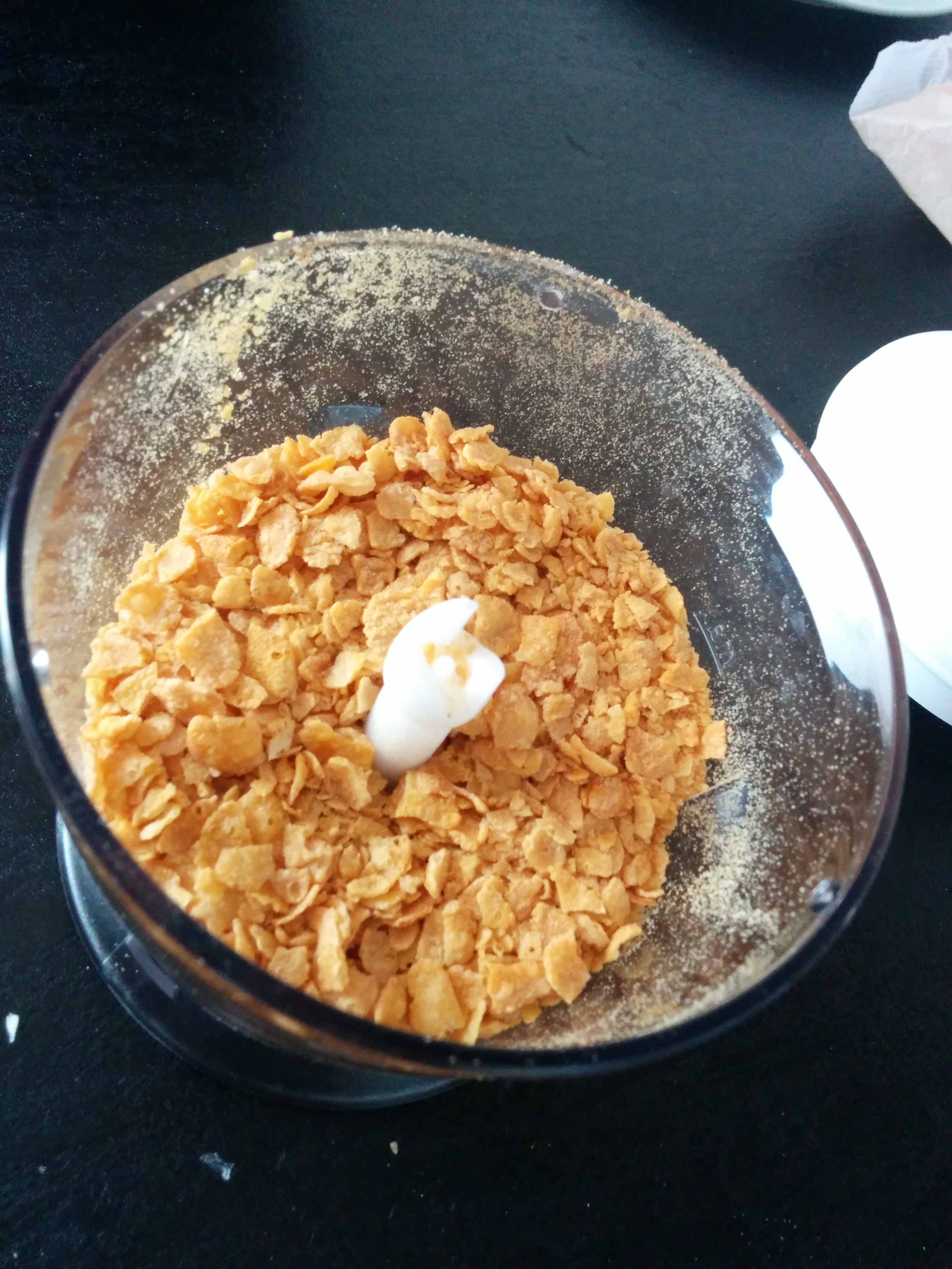 Llegado a este punto… ¡vaya! Para rebozar se suele utilizar pan rallado, se me había olvidado. Pero recordé el rebozado que había empleado una vez: Corn Fleks. Aviso que en algunas marcas sus copos de maíz llevan gluten -pueden ser apropiada para personas con dietas con restricción de gluten- pero también tenemos opciones comerciales sin nada de gluten, así que dependiendo de cada situación, tocara leer con más cuidado los ingredientes. Batidora en mano, con el picador, conseguí que quedara finito finito.